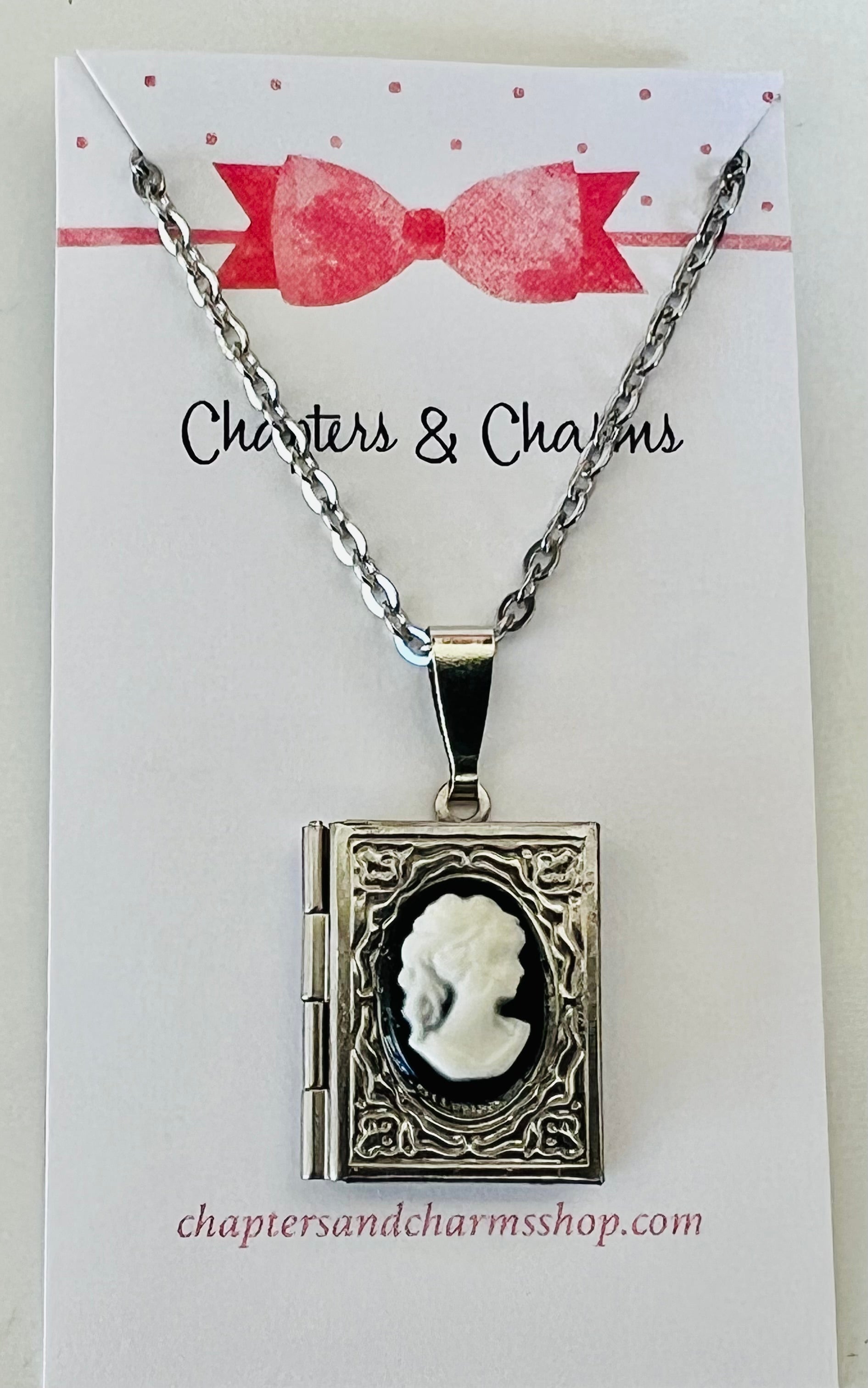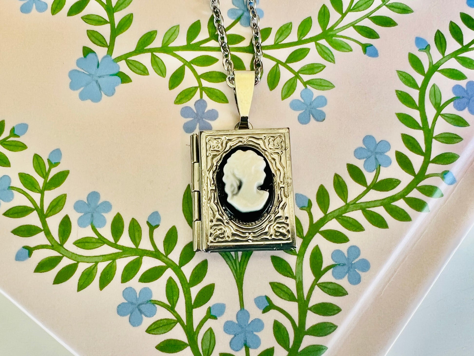 Silver book locket features a powder black and white cameo silhouette. It opens to two small empty wells for your favorite photo keepsake. It hangs on an 18' tarnish resistant gold stainless steel chain with lobster claw closure. Your locket will come prettily packaged all ready for gifting.