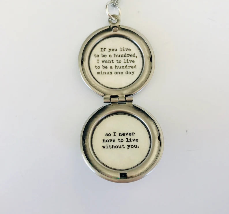 Sweet and sentimental quote from A.A. Milne by his beloved bear, Winnie the Pooh. The locket measures 1 inch and features a sweet Pooh Graphic in the center. The quote inside: “if you Live to be hundred I want to live to be hundred minus one day so I never have to live without you.”