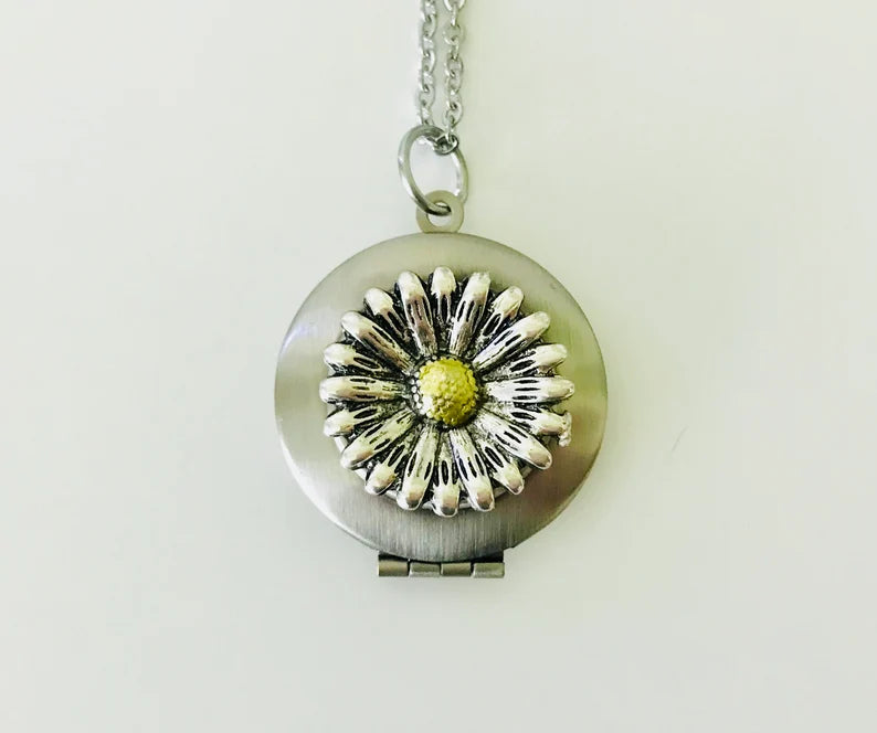 The locket measures about 1 inch. The exterior of the locket showcases a lovely silver sunflower with a golden center. It hangs on a stainless steel chain with a lobster clasp closure. You may select your desired length at checkout.