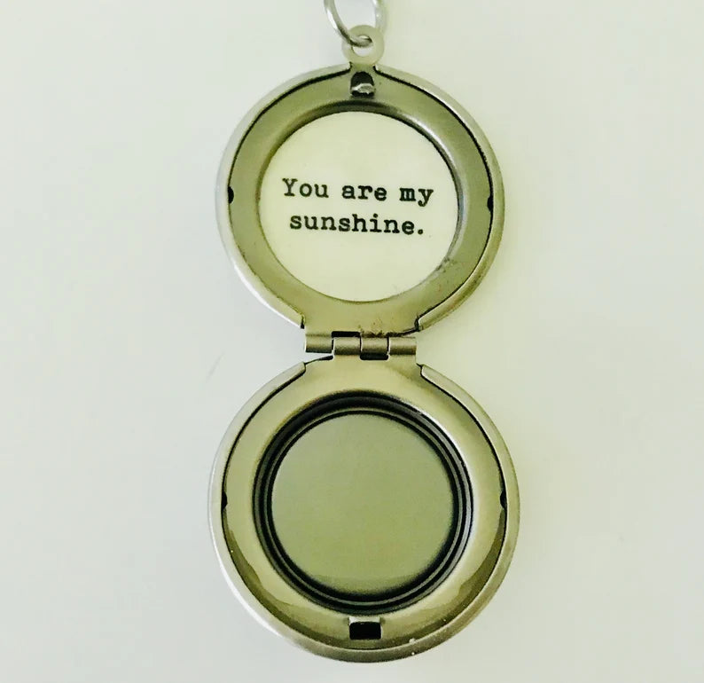 Lovely silver locket opens to the sweet sentiment, 'You are my sunshine'-